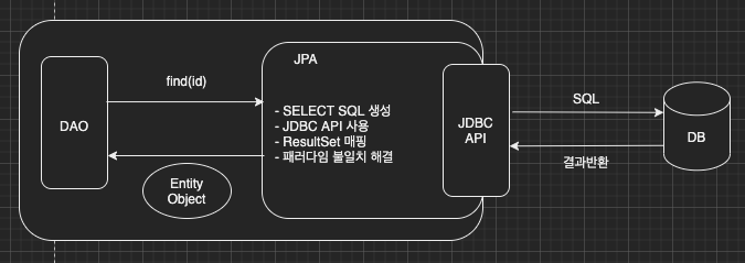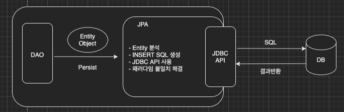 개발자가 직접 SQL문을 작성하지 않아도 JPA가 자동으로 생성하여 JDBC에게 전달하고 원하는 결과를 확인할 수 있다.