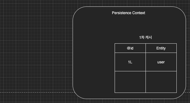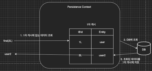 만약 1차 캐시에 없는 내용을 조회한다면 DB에서 데이터를 조회하고 조회된 내용을 1차 캐시에 저장한다.