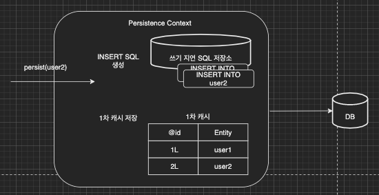 user2가 persist되는 시점에 쓰기 지연 SQL 저장소에 쿼리가 저장되고 1차 캐시에 데이터가 저장된다.