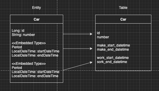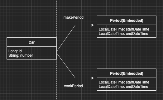 차량 엔티티에 직접 명시되어 있던 기간 관련 변수들이 Period 임베디드 클래스로 따로 선언이 되었다.