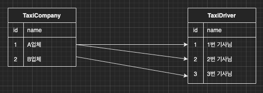아래와 같이 택시 기사(TaxiDriver)를 조회하고 기사의 업체(TaxiCompany)의 이름을 조회하면 기사의 수(N)만큼 쿼리가 추가로 발생한다.