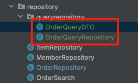 새로운 디렉토리(queryrepository)를 만들고 생성된 디렉토리에 새로운 리포지토리(OrderQueryRepository)와 DTO 클래스(OrderQueryDTO)를 생성하였다.