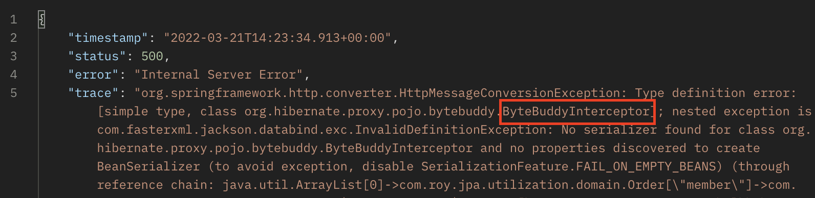 하지만 이렇게 수정하더라도 Jackson 라이브러리에서 member 프록시 객체를 생성하지 못하여 오류가 발생한다.