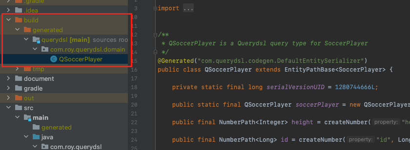 - Q 타입 생성 확인 (build -> generated -> querydsl -> QSoccerPlayer)