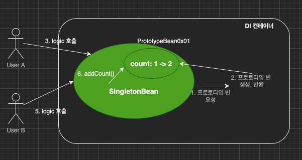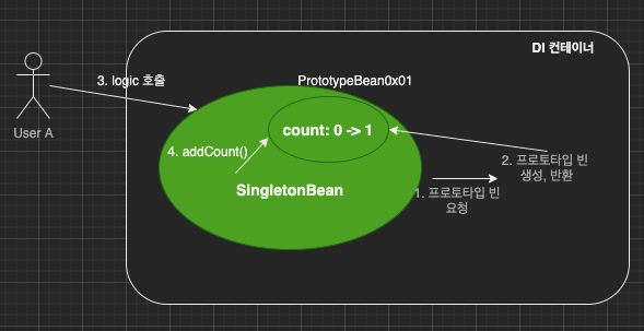 SingletonBean은 싱글톤이므로 DI 컨테이너 생성시점에 함께 생성되고, PrototypeBean을 주입받는다.