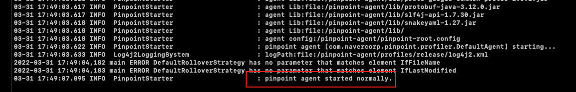 정상적으로 설치가 완료되었다면 아래와 같이 Pinpoint Agent가 성공적으로 실행되었다고 표시될 것이다.