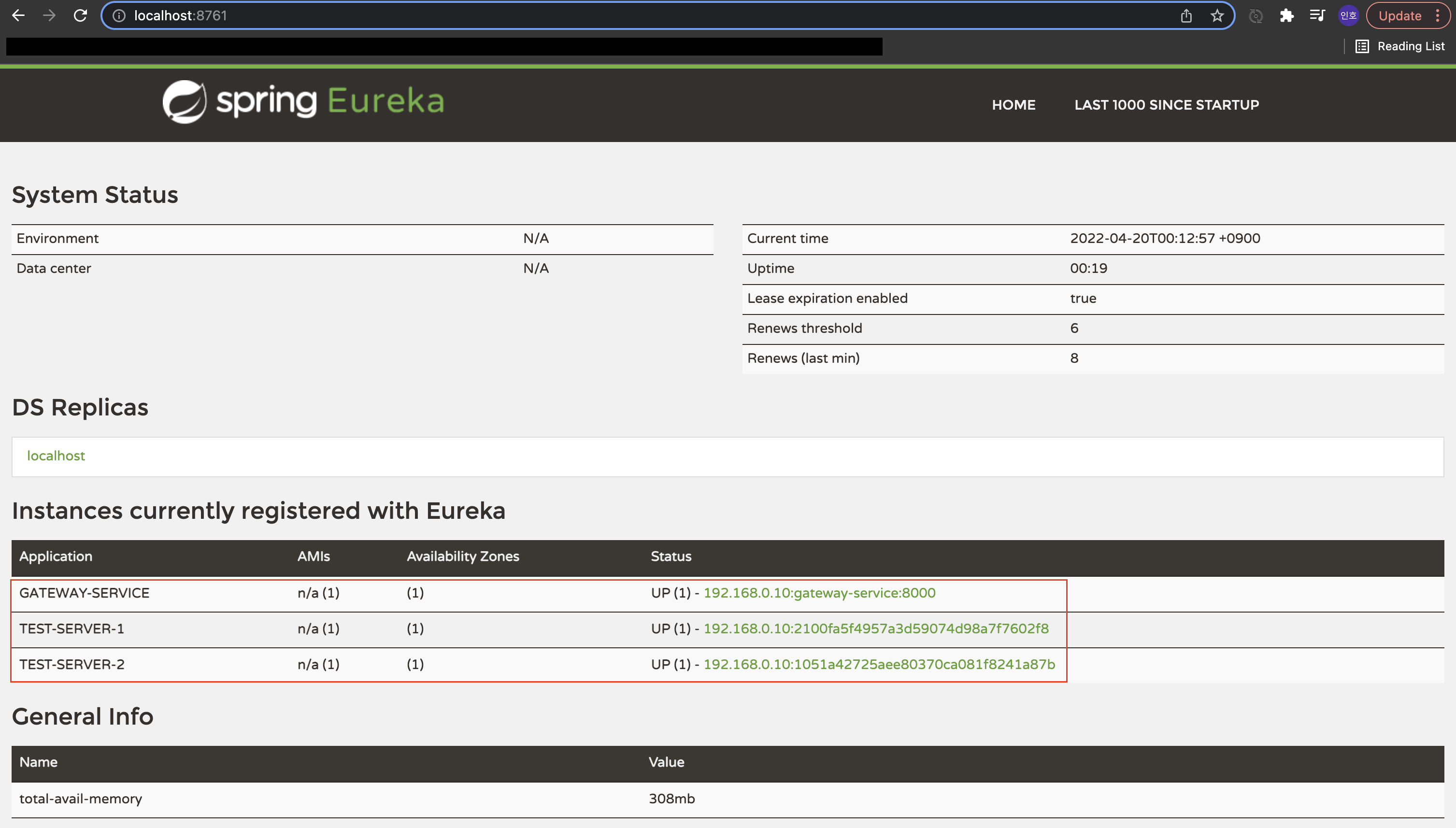 유레카, 게이트웨이, 테스트 프로젝트 1,2 총 네 개의 프로젝트를 전부 실행시키고 유레카 페이지에 접속해본다.