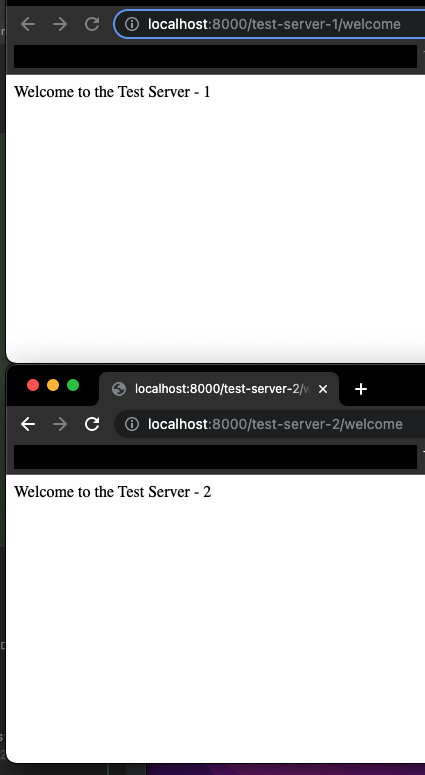 새로운 브라우저를 켜고 localhost:8000/test-server-1/welcome 주소와 localhost:8000/test-server-2/welcome 주소로 접속해본다.