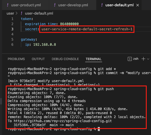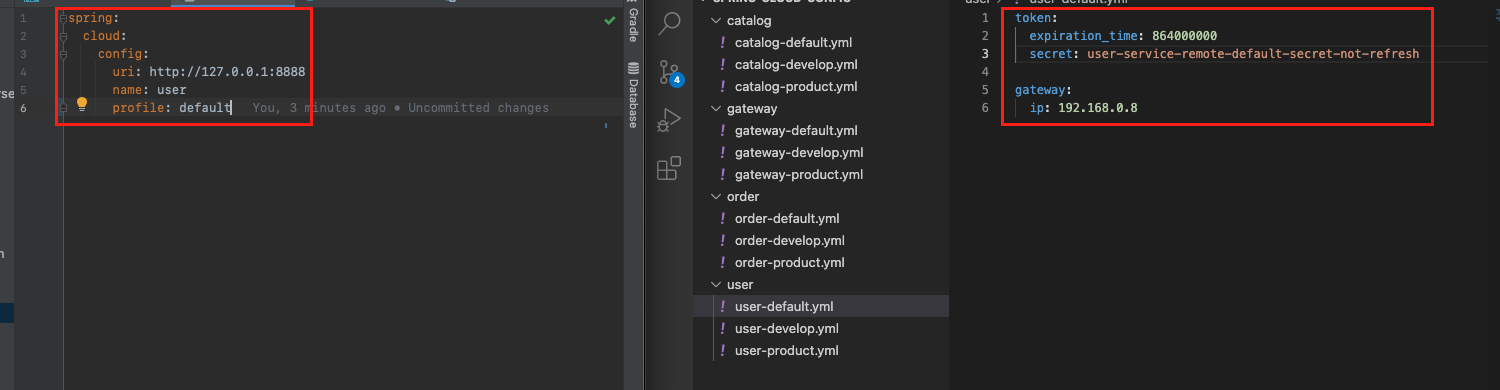 좌측의 설정 파일은 유저 서비스의 bootstrap.yml 파일이며 우측은 Git의 설정파일 저장소 상태다.