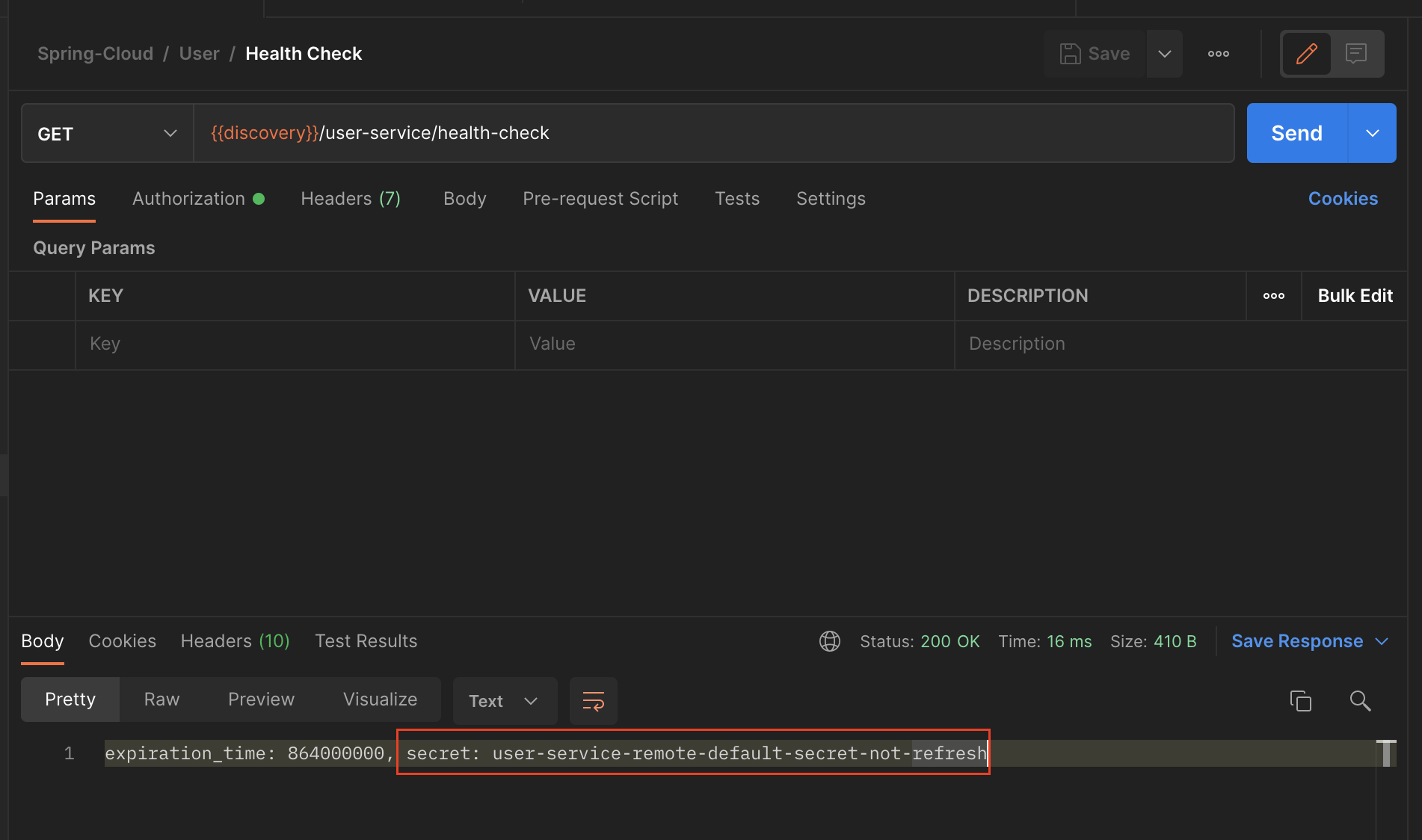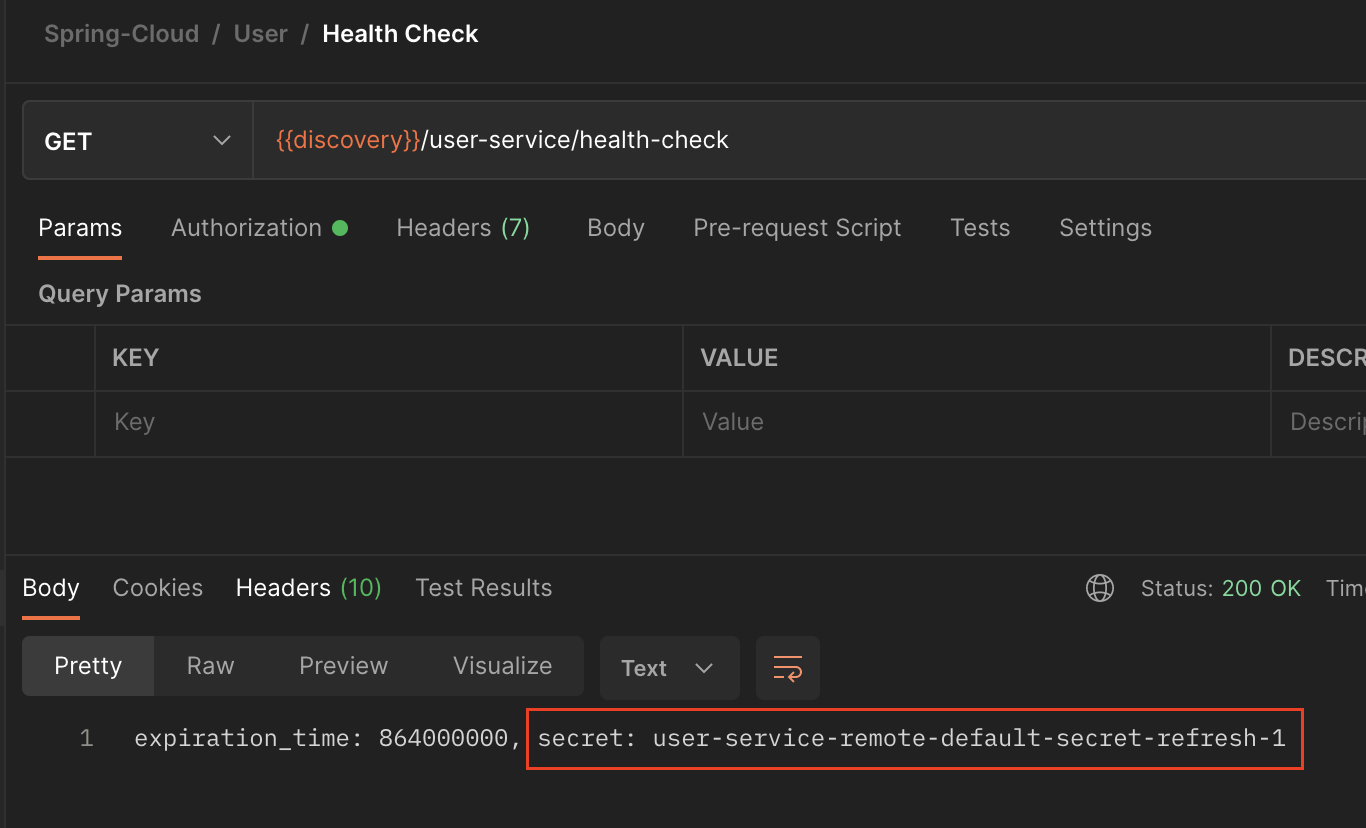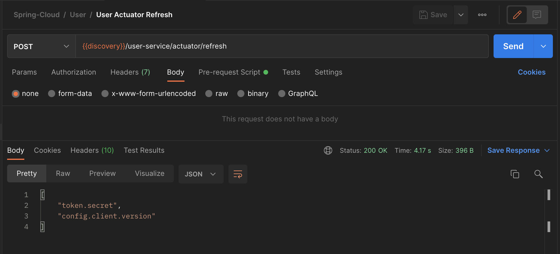 Postman을 사용하여 유저 서비스의 actuator/refresh API를 호출한다.