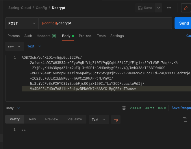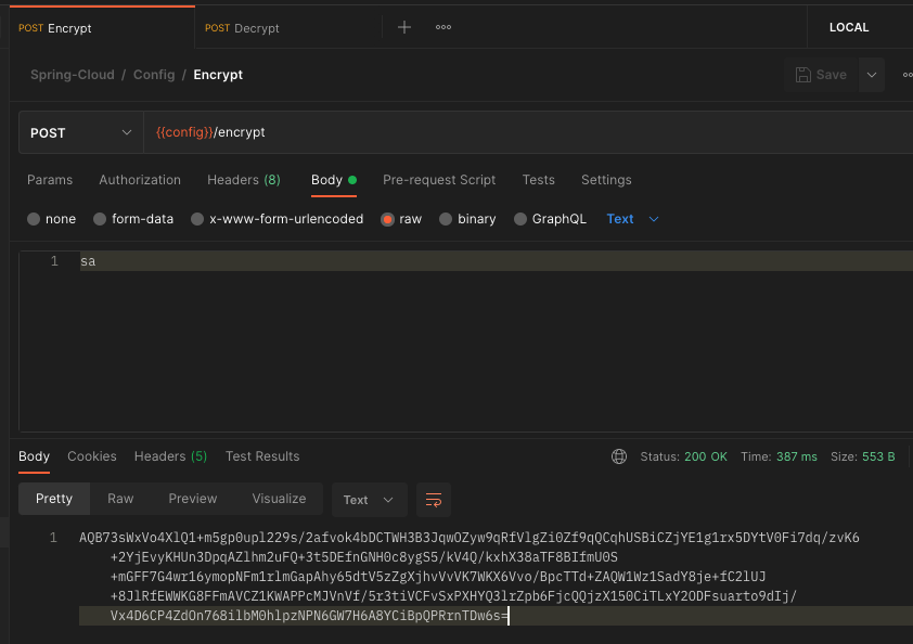 Postman을 사용하여 Config 서버의 encrypt API를 호출한다.