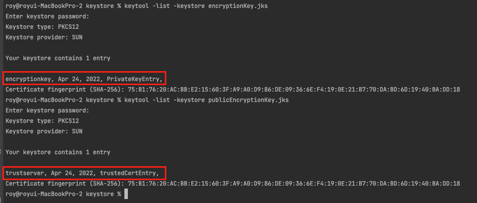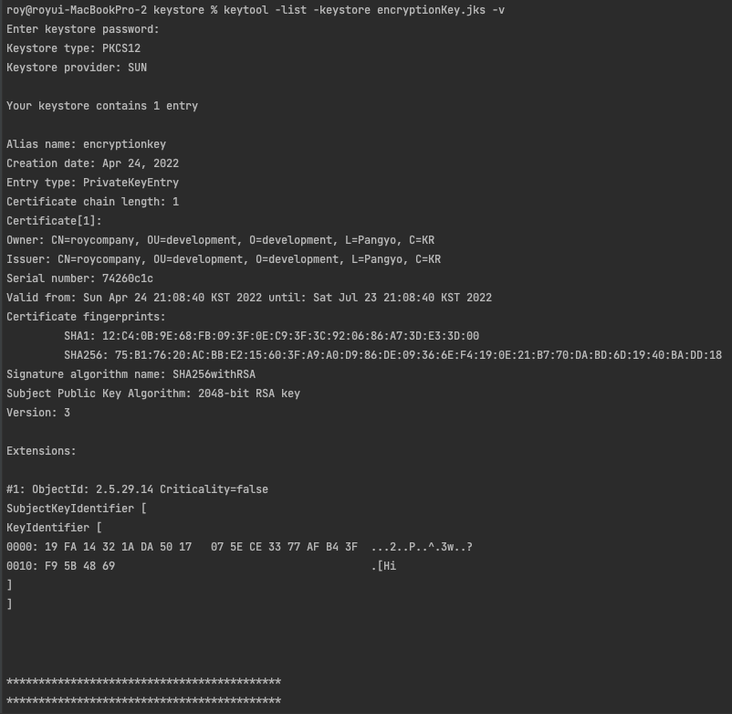 $ keytool -genkeypair -alias encryptionKey -keyalg RSA -dname "CN=roycompany, OU=development, O=development, L=Pangyo, C=KR" \