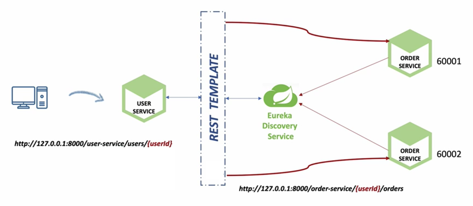 - 유저 서비스는 Rest Template을 통하여 디스커버리 서버에게 사용가능한 주문 서비스의 정보를 조회한다.