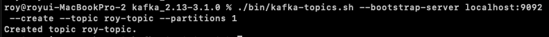 $ ./bin/kafka-topics.sh --bootstrap-server localhost:9092 --create --topic roy-topic --partitions 1