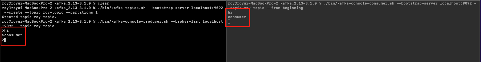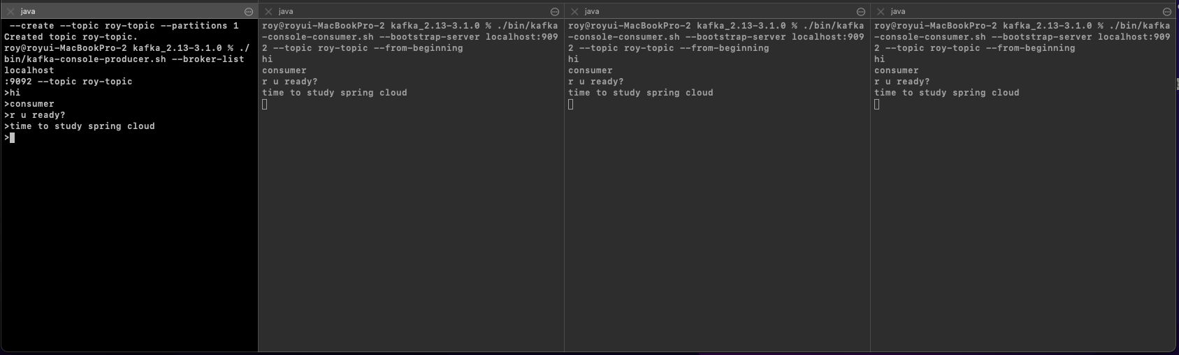 $ ./bin/kafka-console-consumer.sh --bootstrap-server localhost:9092 --topic roy-topic --from-beginning
