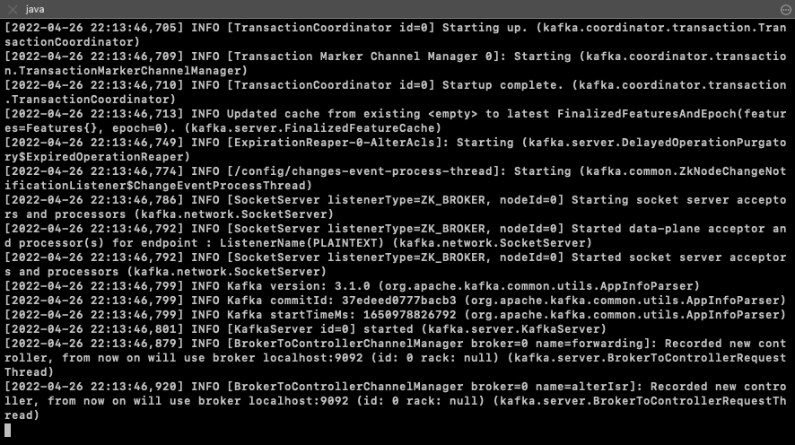 아래의 이미지와 같이 출력된다면 정상적으로 Kafka가 실행된 것이다.