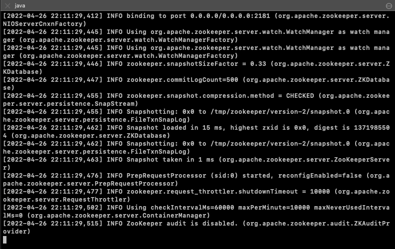 $ ./bin/zookeeper-server-start.sh ./config/zookeeper.properties
