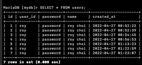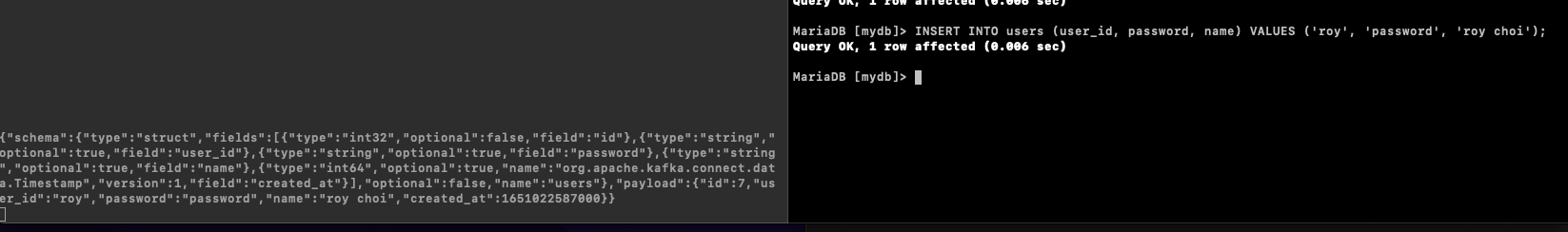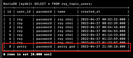 새로운 사용자 정보가 Insert 되었을 때 우리가 예상한 데이터가 전달되는지 확인하기 위해 MariaDB 콘솔로 접속하여 새로운 사용자를 등록해본다.