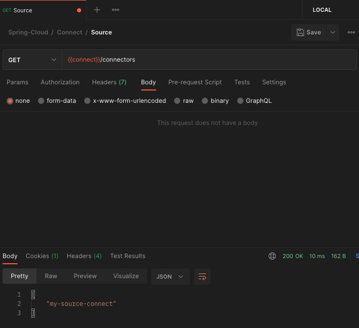우리는 Postman을 사용하여 connect의 connectors API를 호출하여 새로운 정보를 등록할 것이다.