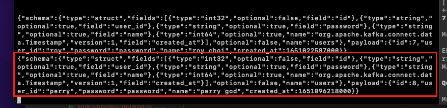 물론 Source Connect가 토픽에 데이터를 집어넣은 것과 동일한 형식으로 직접 토픽에 데이터를 집어넣어도 Sink Connect는 동일하게 반응한다.