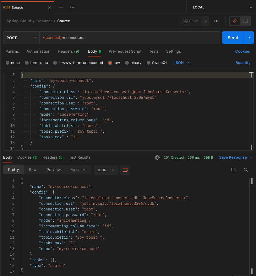 아래와 같이 201 코드가 반환된다면 정상적으로 Source Connect가 등록된 것이다.