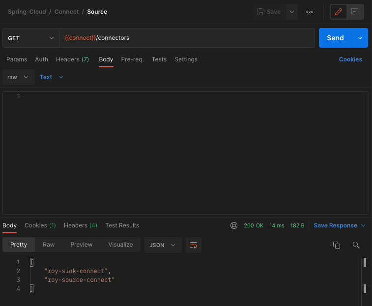 GET http://localhost:8083/connectors 를 호출하면 등록되어 있는 connect 목록을 확인할 수 있다.