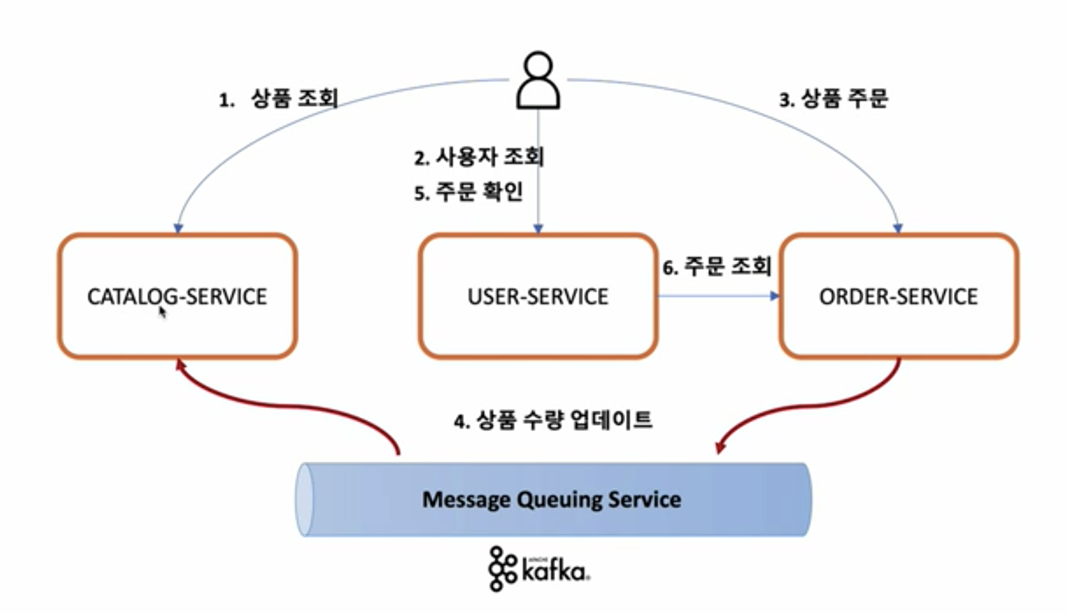 상품 수량을 업데이트하라는 요청을 Kafka에 집어넣고 Kafka에 구독을 걸고 있는 카탈로그 서비스는 이러한 요청을 Kafka로 부터 전달받아 처리한다.