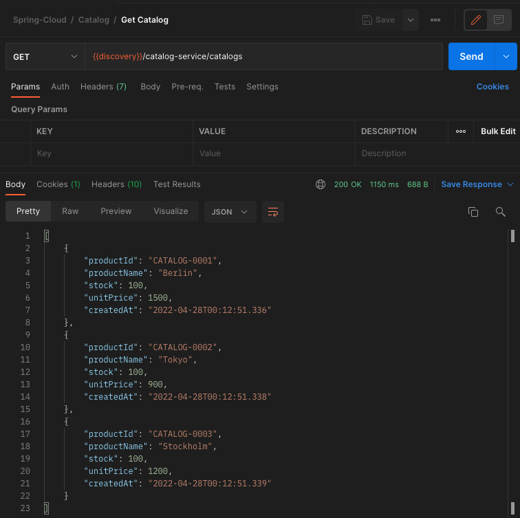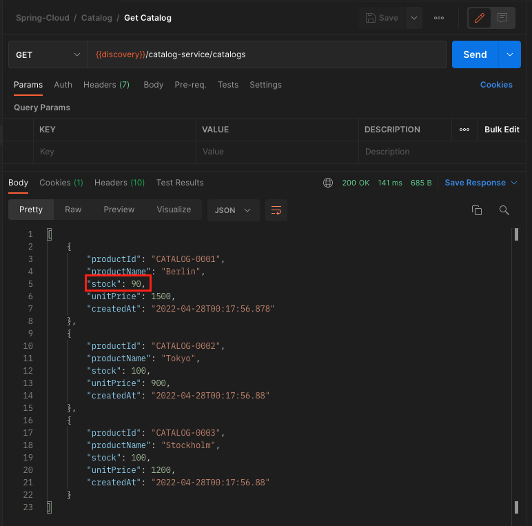 우리가 예상한 결과가 맞는지 카탈로그 서비스의 GET /catalogs API를 호출하여 결과를 확인한다.