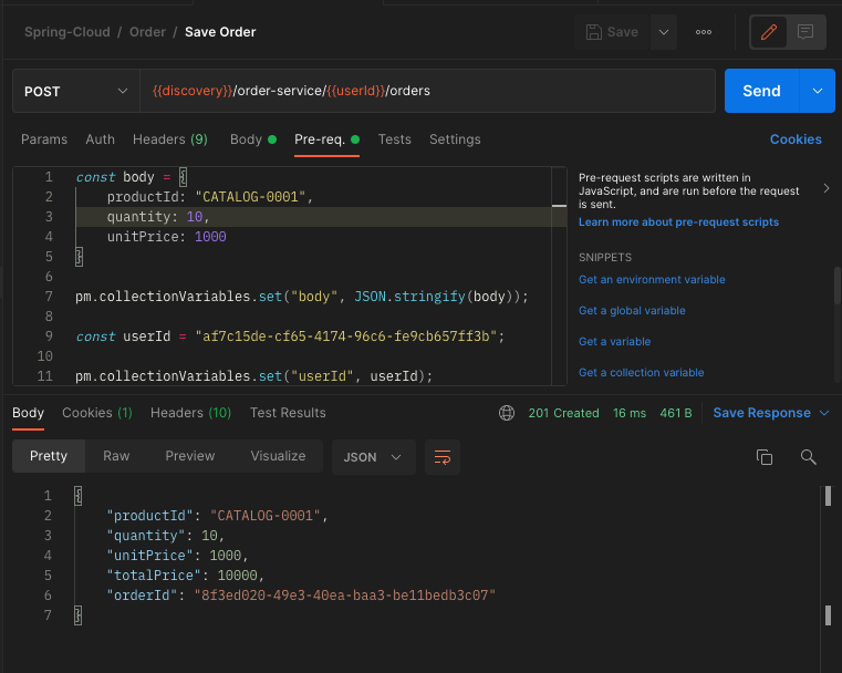 주문 서비스의 POST /orders API를 호출하여 CATALOG-0001를 주문하는 주문 데이터를 생성한다.