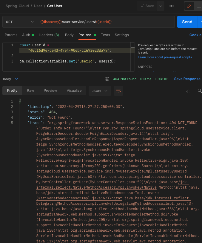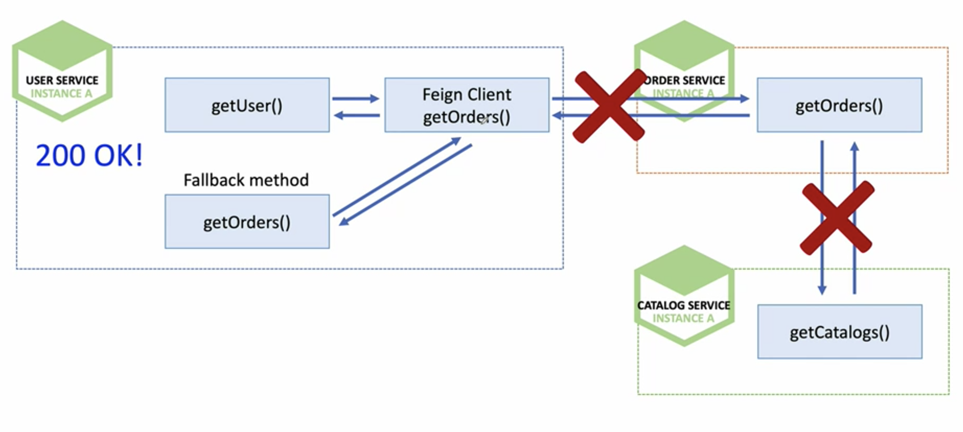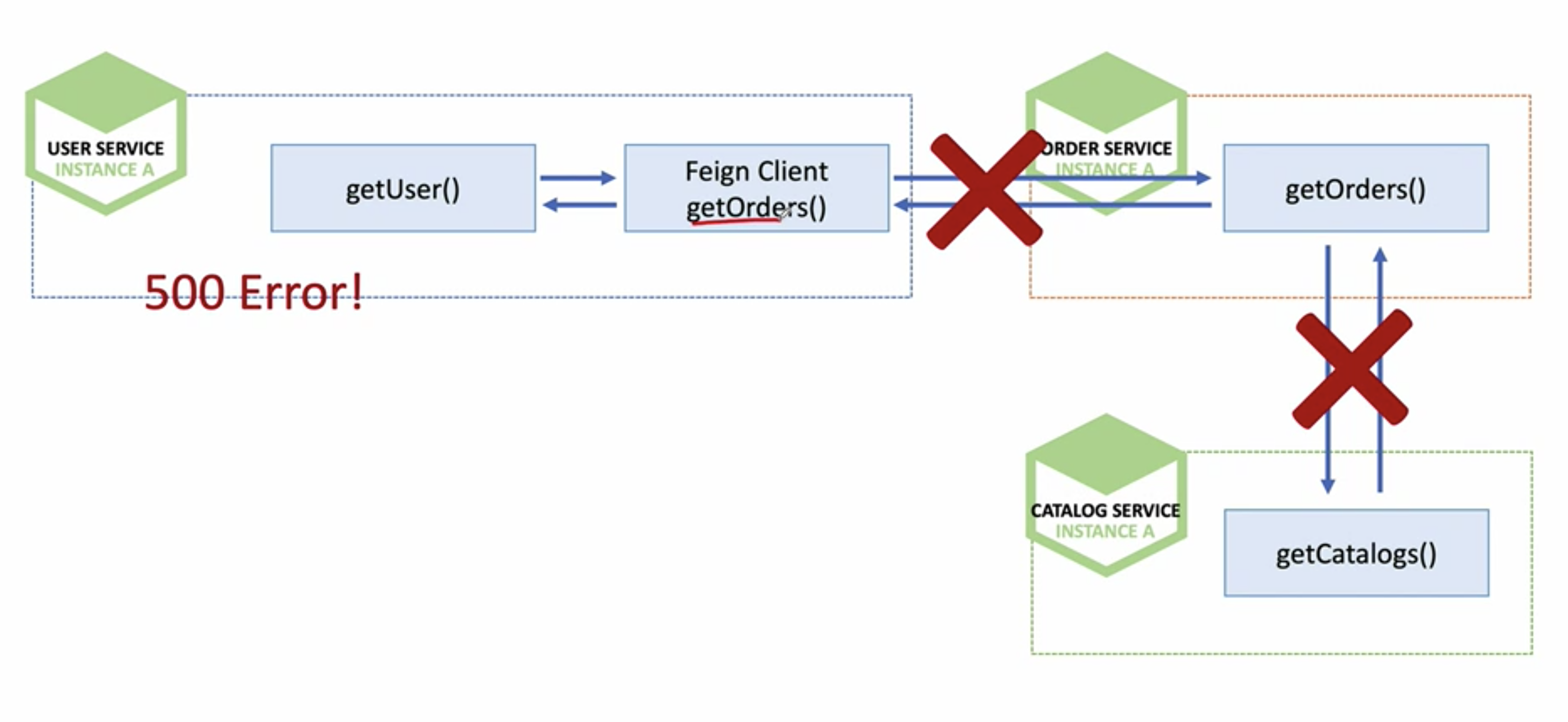 주문 서비스를 호출할 때 오류가 발생할 수 있도록 OrderServiceClient 에서 유효하지 않은 API 경로를 호출한다.