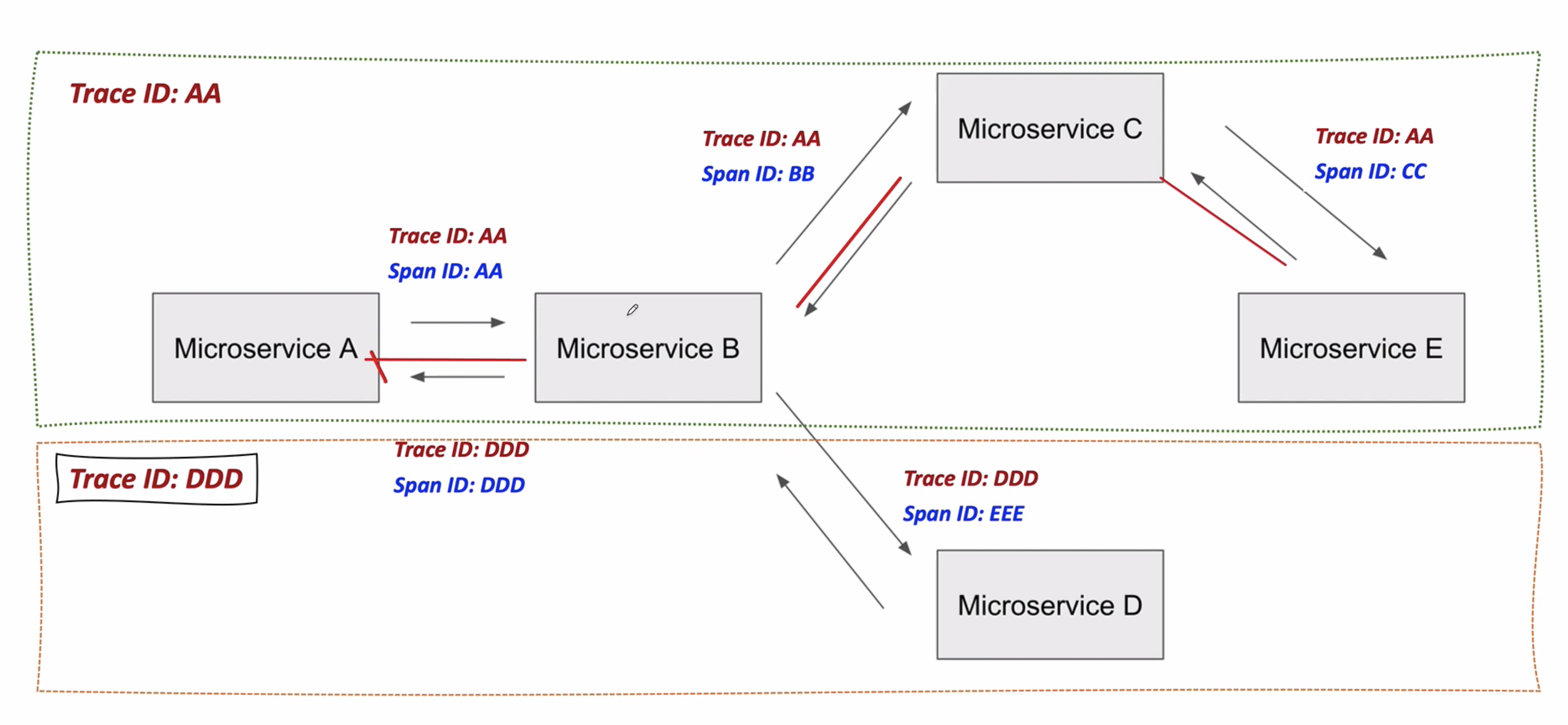 A -> B -> C -> E 의 흐름을 살펴보면 A에서 B를 호출할 때 TraceID: AA와 SpanID: AA가 발급된다.