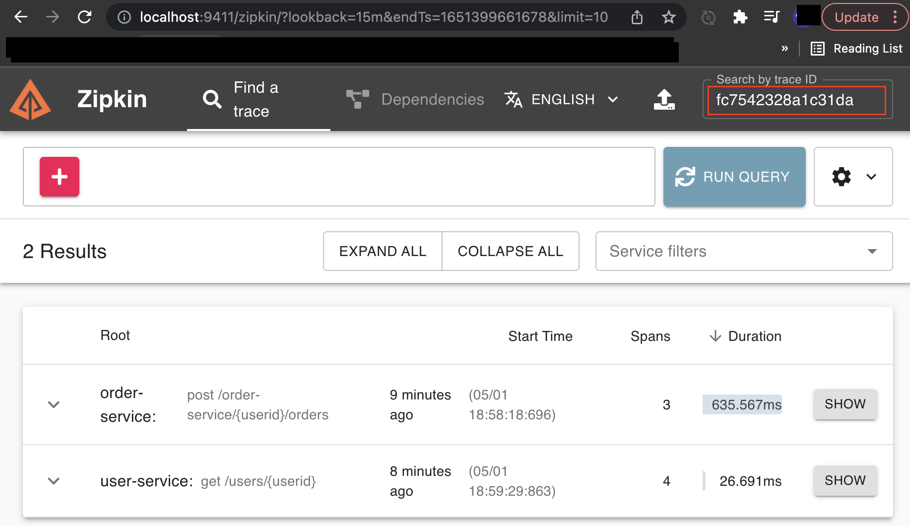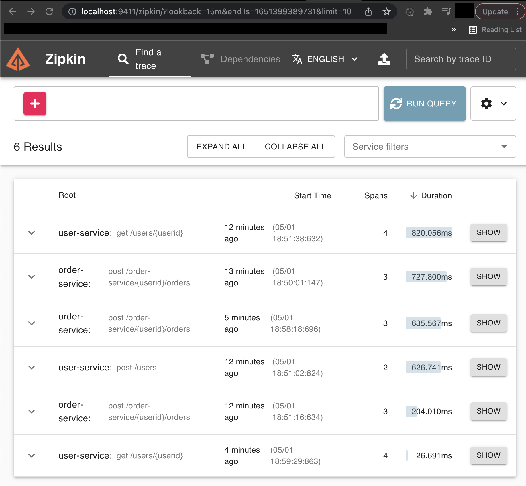 localhostL:9411에 접속하여 Zipkin 페이지에 요청에 대한 정보가 출력되는지 확인한다.