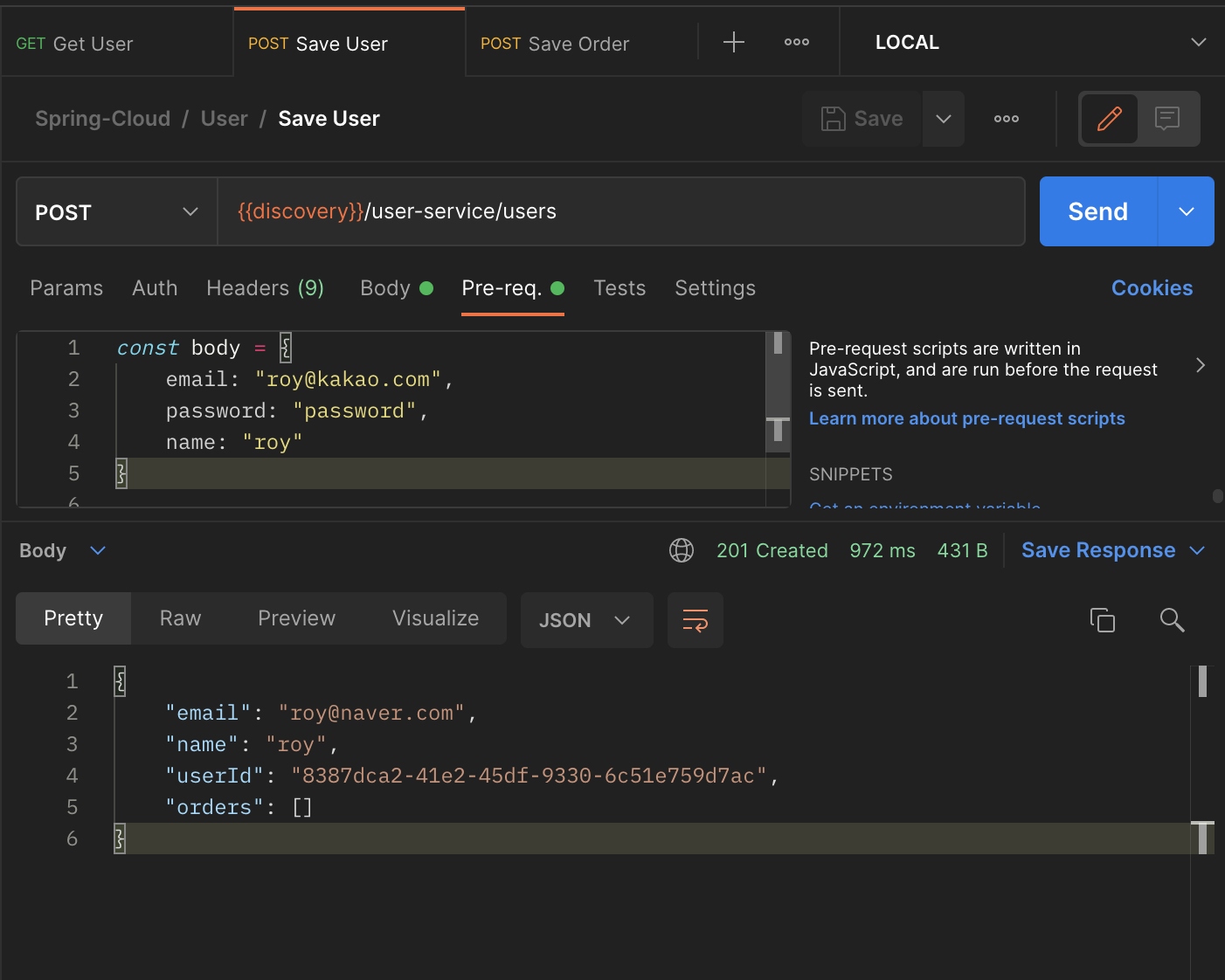 1단계에서 저장된 사용자의 userId를 사용하여 새로운 주문정보를 등록한다.