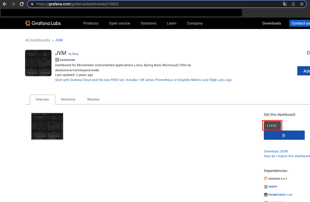 아래의 주소로 접속하여 Dashboard를 추가하기 위해 Get this dashboard에 나와있는 코드 번호를 확인하도록 한다.