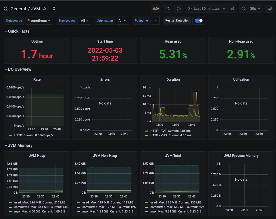 Dashboard -> JVM 을 선택하여 정상적으로 dashboard가 표시되는지 확인한다.