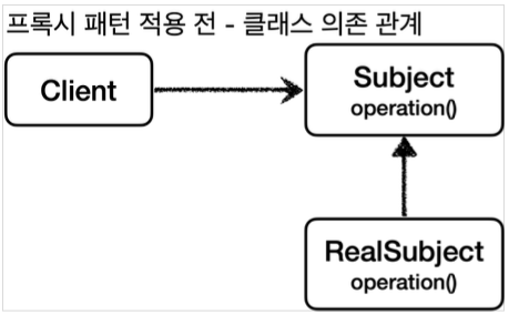 클라이언트-서버 관계 중간에 프록시 객체를 두어 클라이언트-프록시-서버 관계로 객체 의존관계를 변경하면 객체 의존 관계는 아래와 같다.