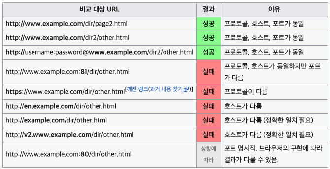 여기서 출처는 두 개의 URL의 프로토콜, 포트(명시하는 경우), 호스트가 모두 같아야 동일한 출처라고 말한다.