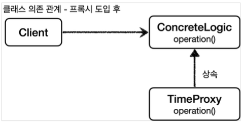 클라이언트는 구체 클래스의 객체가 아니라 프록시 객체를 의존하고 있으며 프록시 객체가 구체 클래스의 메서드를 호출하고 있다.