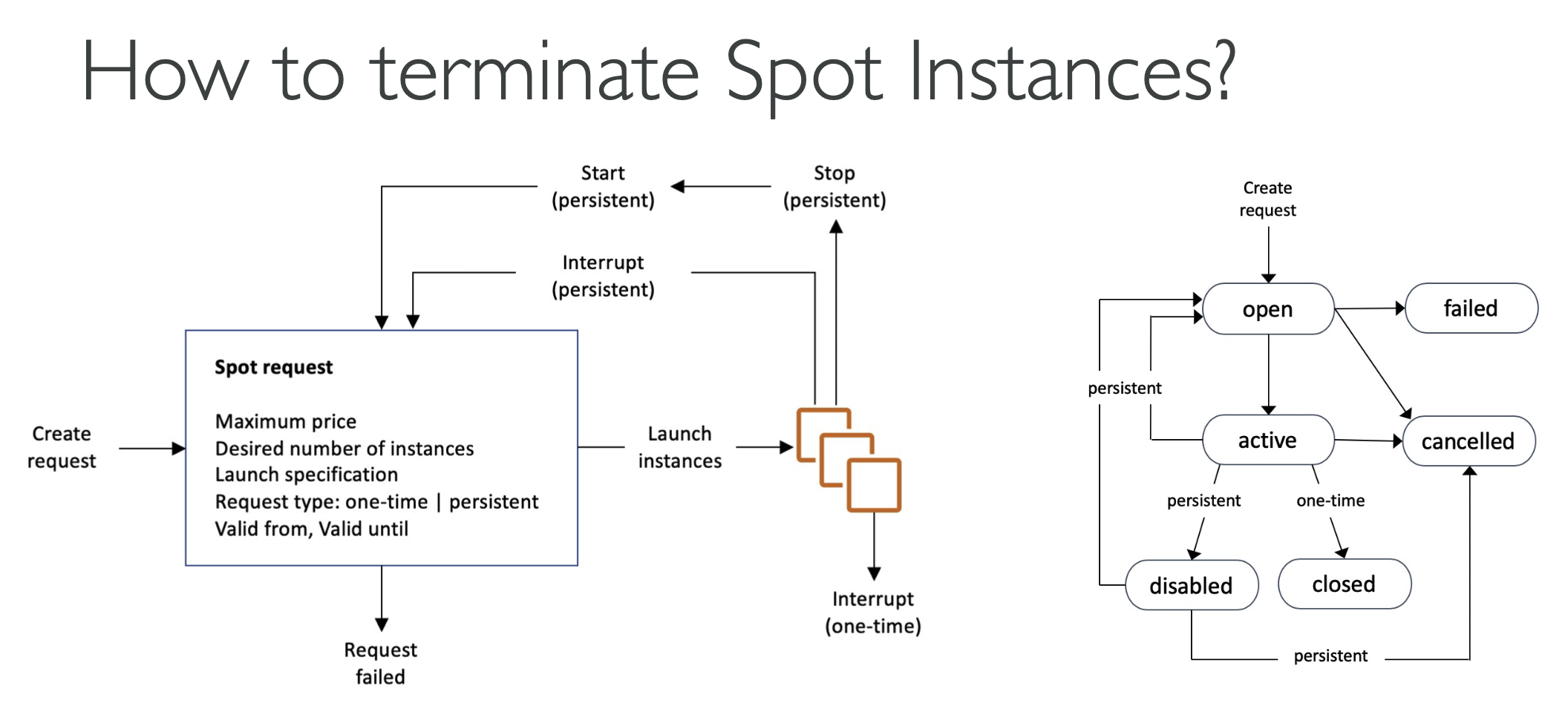 - 열려 있거나 활성화되어 있거나 비활성화된 스팟 인스턴스 요청만 취소할 수 있다. 스팟 요청을 취소해도 인스턴스가 종료되지 않으며, 먼저 스팟 요청을 취소한 다음 연결된 스팟 인스턴스를 종료해야 한다.