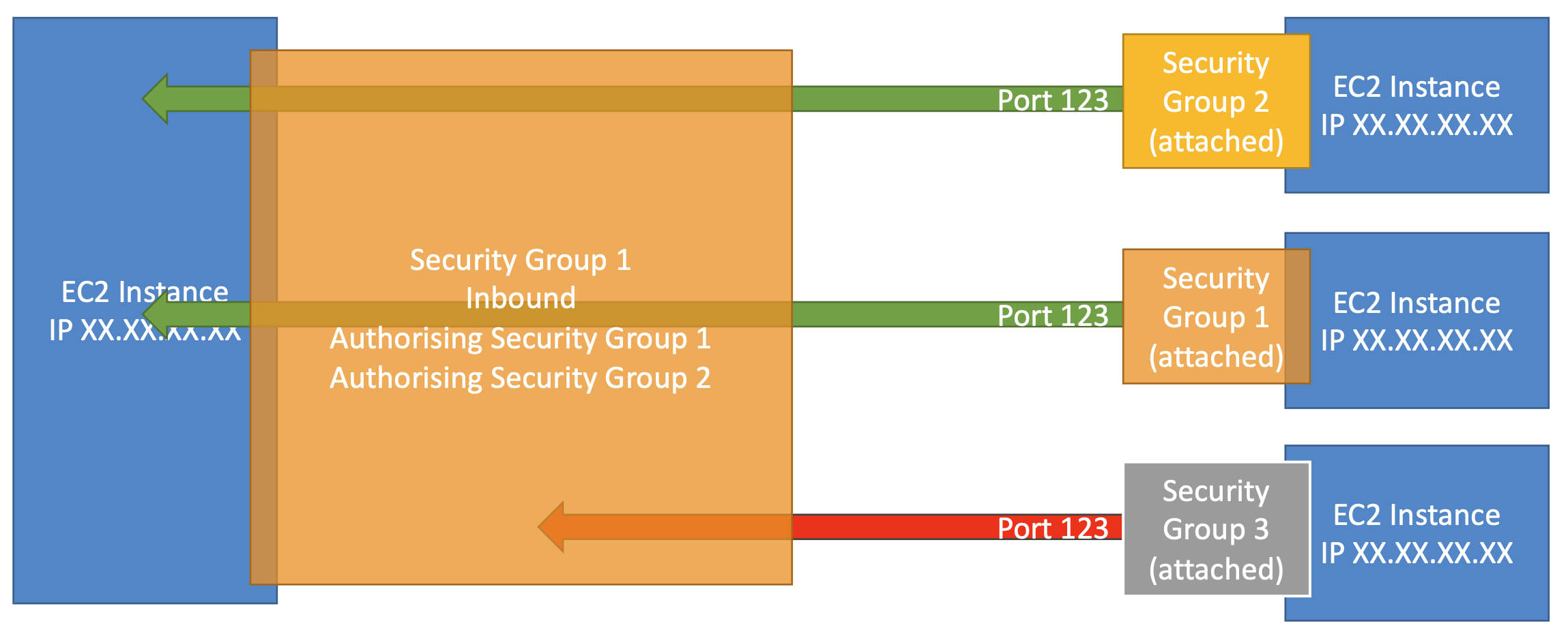 allow규칙만을 포함한다. - 보안 그룹 규칙은 IP 또는 보안 그룹별로 참조할 수 있다.