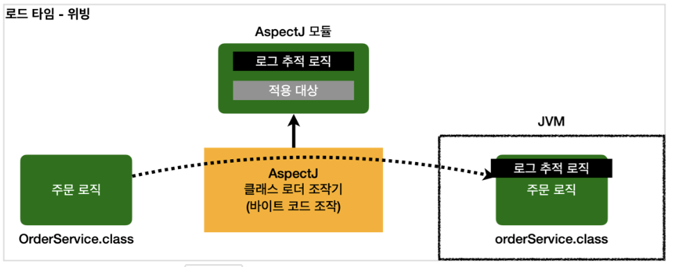 - 클래스 로딩 시점: 실제 대상 코드에 애스펙트를 통한 부가 기능 호출 코드가 포함된다. AspectJ를 직접 사용해야 한다.