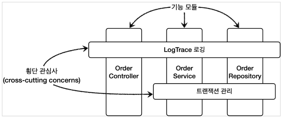 주문 로직을 실행하기 직전에 로그 추적 기능을 사용해야 하면, 핵심 기능인 주문 로직과 부가 기능인 로그 추적 로직이 하나의 객체 안에 섞여 들어가게 된다.