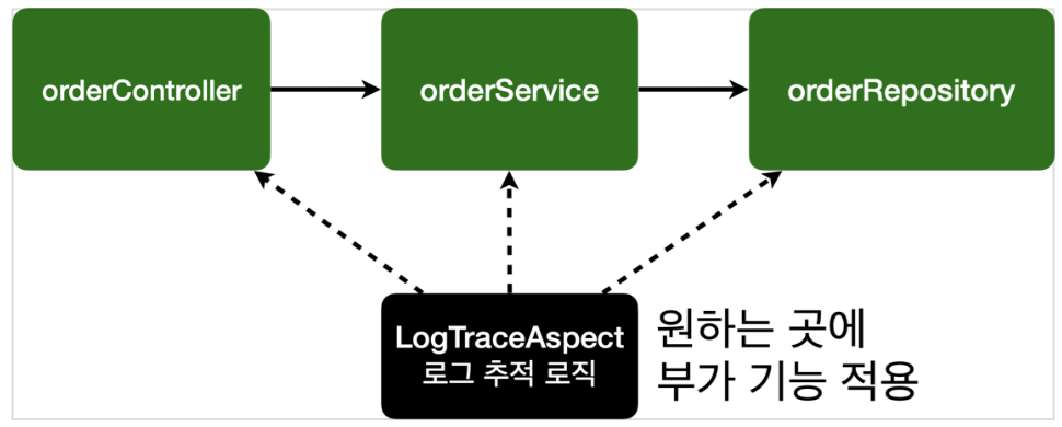 부가 기능이 필요한 경우 이렇게 둘을 합해서 하나의 로직을 완성하고, 주문 서비스를 실행하면 핵심 기능인 주문 로직과, 부가 기능인 로그 추적 로직이 함께 실행된다.