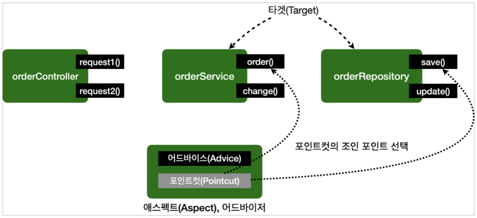 우리가 이전 장에서 알아본 @Aspect가 이러한 기능들을 한다. 그리고 스프링이 제공하는 어드바이저도 어드바이스(부가 기능)과 포인트컷(적용 대상)을 가지고 있기 때문에 개념상 하나의 애스펙트로 볼 수 있다.