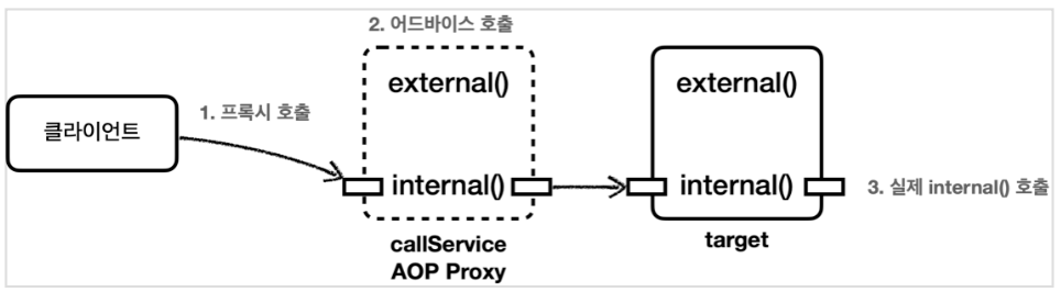 AOP 프록시는 target.external()을 호출한다. 문제는 callServiceVersion0.external()안에서 internal()을 호출할 때 발생한다.CallLogAspect 어드바이스가 호출되지 않는다.