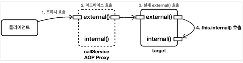 프록시 객체가 주입되기 때문에 대상 객체를 직접 호출하는 문제는 일반적으로 발생하지 않는다. 하지만 대상 객체의 내부에서 메서드 호출이 발생하면 프록시를 거치지 않고 대상 객체를 직접 호출하는 문제가 발생한다.
