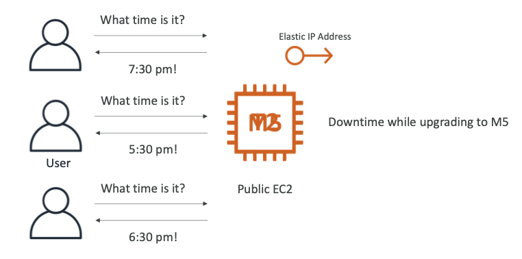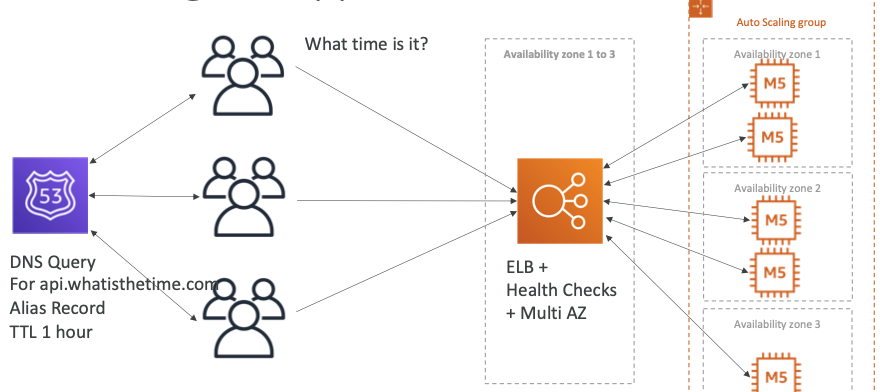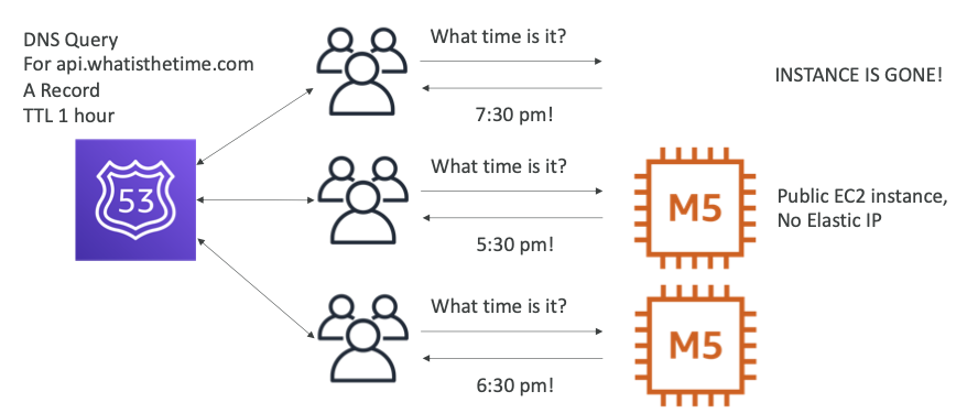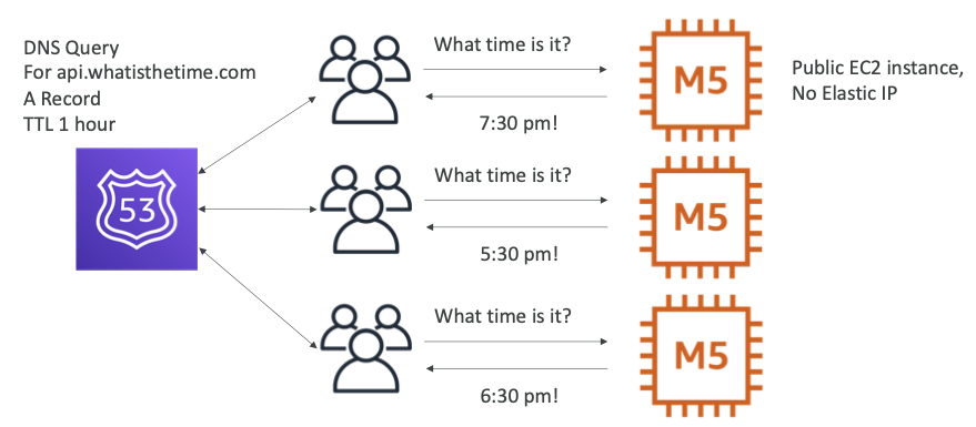 api.whatisthetime.com레코드에 대한 DNS 쿼리, TTL 1시간- 공개 EC2 인스턴스, 탄력적 IP(EIP)가 없다.