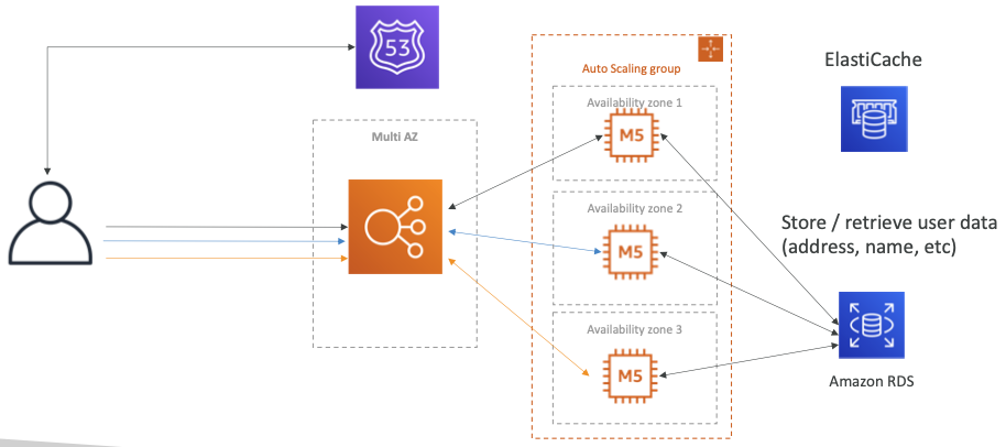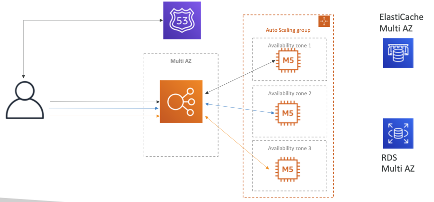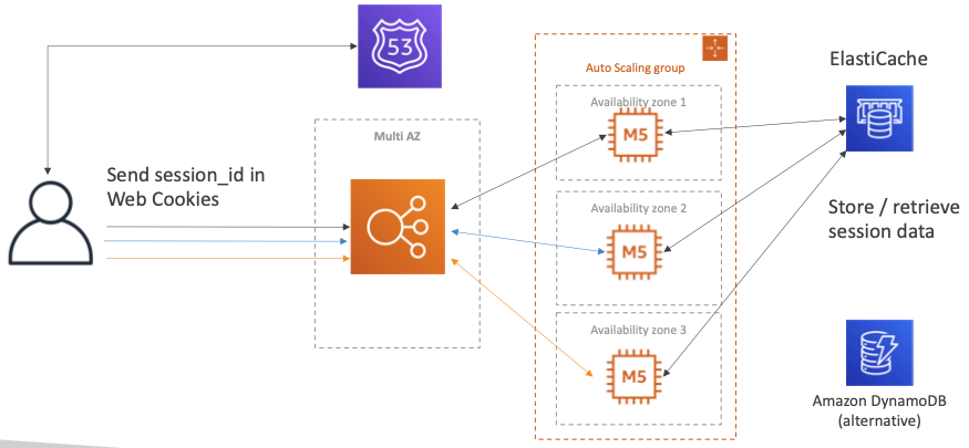 - 각 인스턴스의 서비스는 세션 데이터를 저장하고 있는 “ElastiCache”를 통해 세션 데이터를 조회한다.