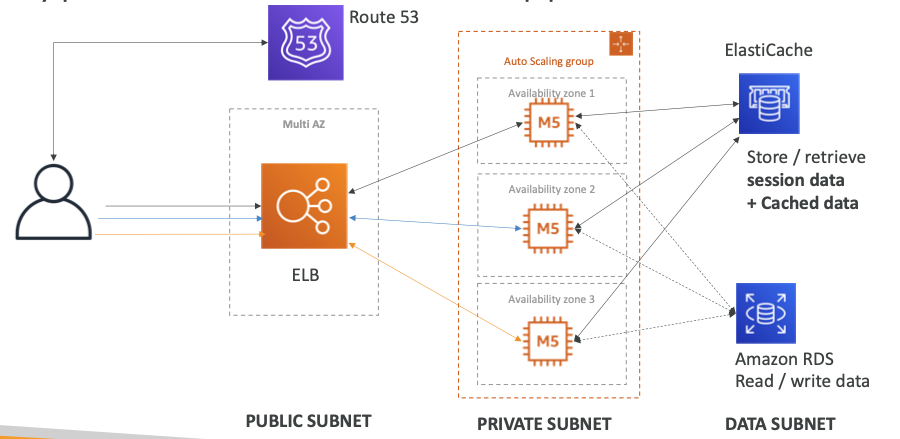 - “ElastiCache”를 사용하여 세션 데이터를 저장하고 검색하거나 자주 조회되는 데이터를 캐시한다.