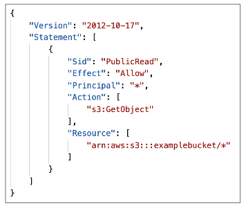 Resource: 버킷(buckets) 및 객체(objects)Action: 허용(allow) 또는 거부(deny)할 API 집합Effect: 허용(allow) / 거부(deny)Principle: 정책을 적용할 계정 또는 사용자